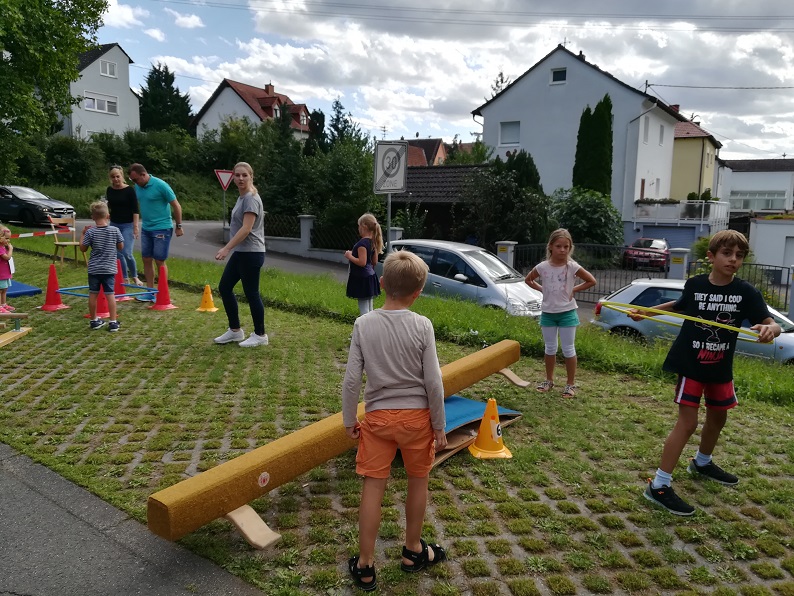 Ab 14.30 Uhr stand für die Kinder eine Hüpfburg bereit, auf der sich die Kinder austobten. Ein Spielparcours mit Übungen zum Balancieren, Rollen, Stützen, Seilspringen, Hula-Hoop und einiges mehr fand großen Anklang. Die Kinder „erturnten“ sich Stempel und bei vielen Punkten holten sie sich einen Preis ab.  In der Zwischenzeit saßen die Eltern unter den Kastanienbäumen bei Kaffee und Kuchen.