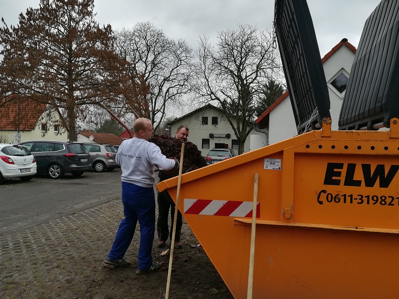 Haufenweise altes Laub, alte Äste und etwas Gerümpel wurden entsorgt. Unter den Hecken, hinter der Halle und besonders auf dem rechten Parkplatz wurde gerecht, gehackt und gekehrt. Die Helfer brachten Schubkarre und weitere Gerätschaften mit. Mit viel Elan und netten Gesprächen zwischendurch waren am Ende alle zufrieden mit der erledigten Arbeit.