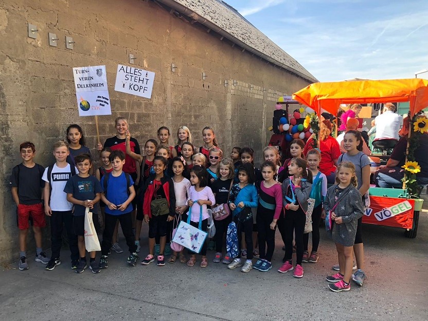 Auch in diesem Jahr waren die Turner und Turnerinnen beim Kerbeumzug der Delkenheimer Kerbegesellschaft Edelweiß dabei. Unter dem Motto: „Die Welt steht Kopf – aber Delgem is gut druff“ schlugen die Mädchen und Jungs Räder durch Delkenheim und zeigten ihr Können auf der Straße. Begleitet wurden sie von Bea und Vivien. Zu Fuß ging es bei strahlendem Sonnenschein durch Delkenheim. Aufgrund der zahlreichen Beteiligung dauerte der Umzug über 2 Stunden, bis man am Bürgerhaus an kam. Der Kuchverkauf im Bürgerhaus übernahm der Turnverein.