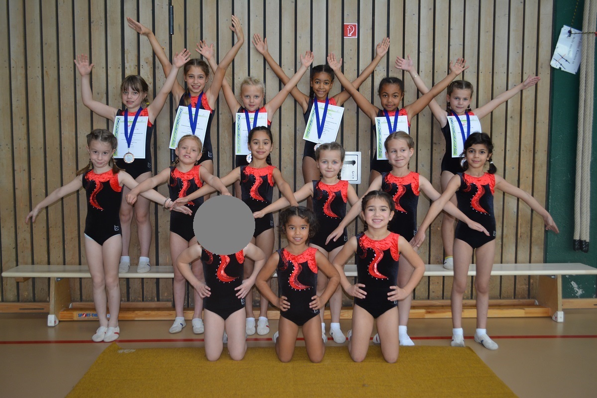 Erfreulicherweise konnte der TVD im Jahrgang 2013 auch eine Mannschaft stellen. Hier traten Mila K., Eva B., Ella M. und Selin Y. an. Für Ella und Selin war es der erste Wettkampf und deshalb war die Aufregung bei ihnen besonders groß. Ella zeigte einen tollen dynamischen Sprung. Trotz ihrer kleinen Größe bewältigt sie den Handstandüberschlag auf dem 80 cm hohen Mattenberg mit Bravour. Sie erhielt mit 12,95 von 14 Punkten die beste Wertung der Mannschaft. Am Reck und Balken erturnte sich Mila die höchste Mannschaftswertung. Mit 12,20 von 13 Punkten erhielt sie am Balken fasst die volle Punktzahl und überzeugte die Kampfrichter von ihrem Können. Selin bekam mit 10,80 Punkte ebenfalls ihre höchste Wertung am Balken. Sie bewies, dass sie bereits nach kurzer Trainingszeit tolle Leistungen zeigen kann. Am Boden überzeugte Eva. Hier turnte sie die höchste Stufe. Handstandabrollen, Rolle rückwärts und Flugrolle gelingen ihr in guter Ausführung. Mit 142,05 Punkten belegten sie den 1. Platz und durften auf die höchste Stufe des Siegertreppchens klettern, um ihre Goldmedaillen abholen. Die Einzelwertung gewann Mila mit 47,75 Punkten knapp vor Ella mit 47,65 Punkten. Die Jüngsten zeigten, dass großes Talent in ihnen steckt und sie im Vergleich mit den ein Jahr älteren Turnerinnen den zweiten Platz belegt hätten. Wir freuen uns auf die nächsten Wettkämpfe, bei denen sie ihr Talent zeigen können.