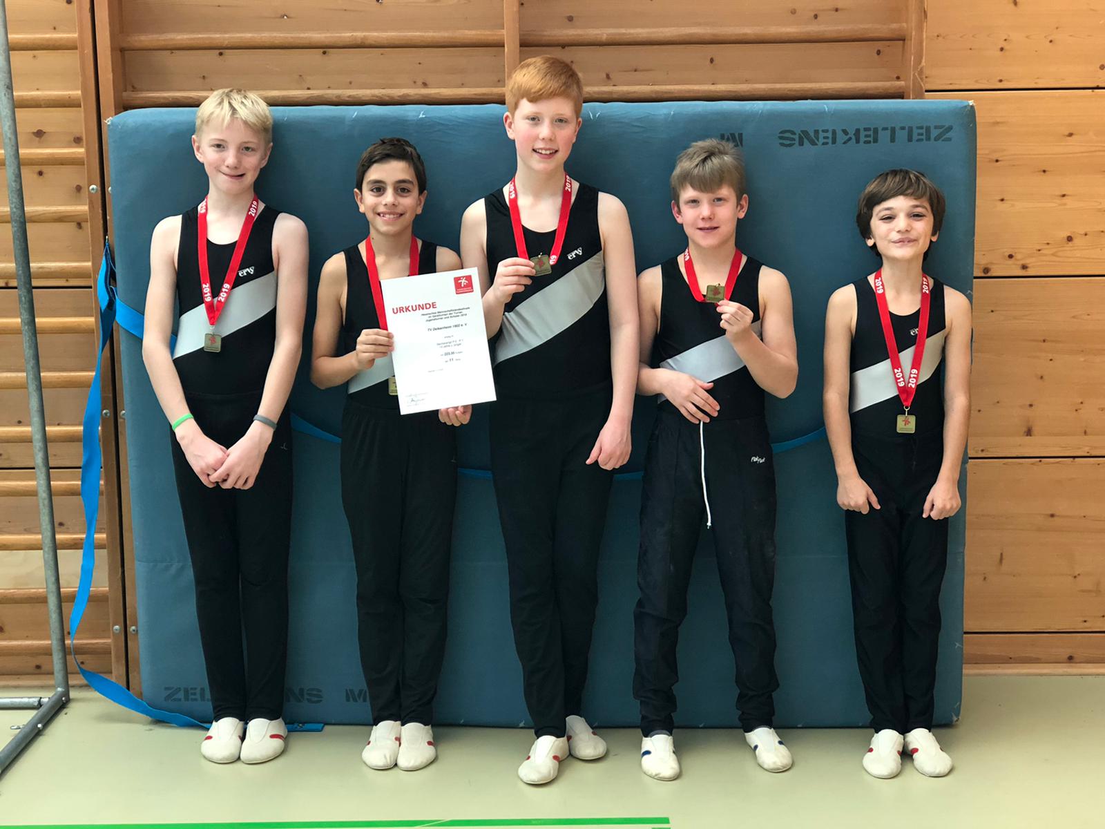 Im Wettkampf P5-P7 traten die Jungs gegen insgesamt zwölf Mannschaften an. An jedem Gerät gingen nur die Wertungen der drei besten Turner in die Gesamtrechnung mit ein. Ihren Wettkampf starteten die Jungs vom TVD an den Ringen. In olympischer Reihenfolge folgten im Anschluss die Geräte Sprung, Barren, Reck, Boden und Pauschenpferd. Die beste Mannschaftswertung erturnten sich Connor, Timo, Theo, Brian und Eren am Sprung. Hier sprangen zwei Jungs einen Handstütz-Überschlag über den 1,25m hohen Sprungtisch (P7). Für Timo und Connor waren es die ersten Hessischen Mannschaften. Beide zeigten ihre beste Leistung am Sprung. Eren, der zu den jüngsten Turnen des Tages zählte, erhielt die beste Wertung mit technisch sauberen Schwüngen und einer hohen Wende am Parallel-Barren. Theo überzeugte im Verhältnis zu seinen Mannschaftskameraden am Reck am meisten und turnte auch sonst einen sicheren Wettkampf. Brian erhielt die beste Gesamtleistung seiner Mannschaft. Seine besten Wertungen erhielt er am Sprung und Boden.